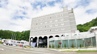 「日帰り入浴芦別温泉」はホテル建物(画像三角屋根)の向こう側。料金はふつう。小学生は半額。営業時間07:00-21:00。風呂は大浴場と泡沫風呂。石けん類は「固形石けん」のみ(こちらも閑散期にメンテナンス休業)。